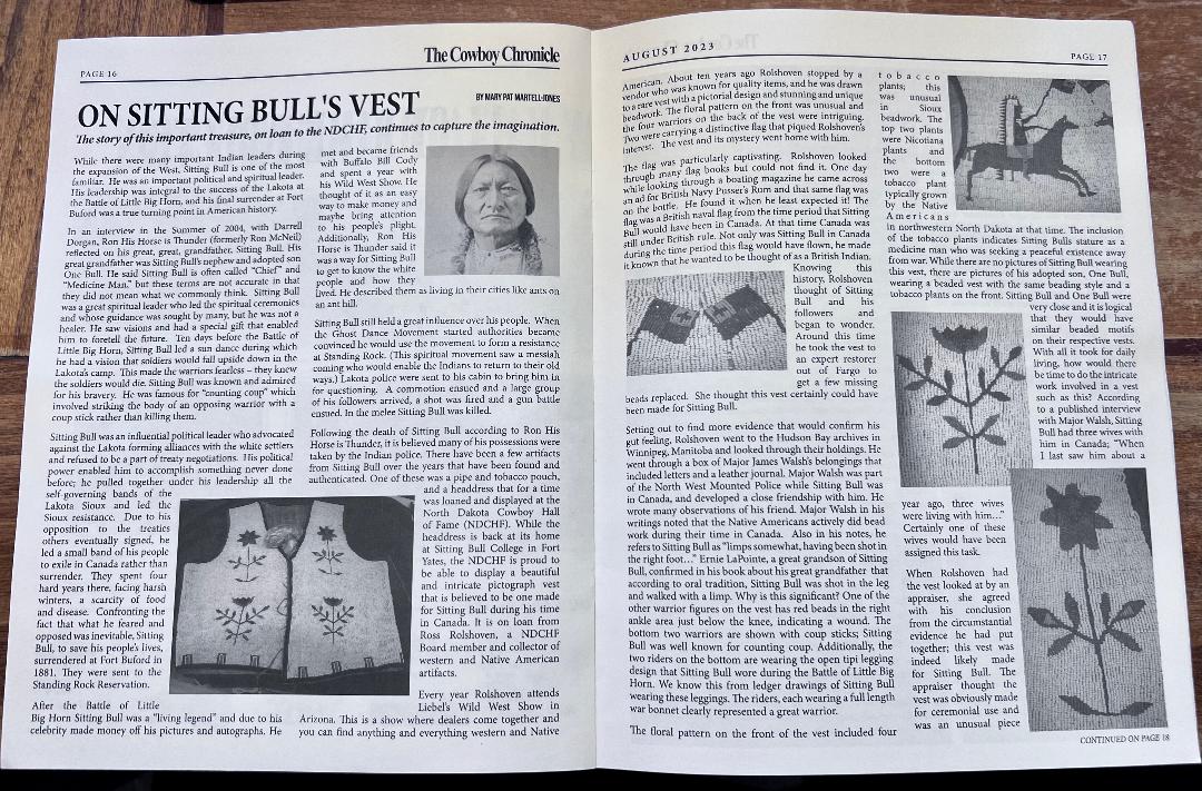 In 2019 when the Antique Roadshow was in West Fargo, Rolshoven had artifacts expert Bruce Shackelford, take a look at the vest. Shackleford agreed with Rolshoven’s research and conclusion. Rolshoven has been back to the Wild West show and spoke with the vendor from whom he bought the vest. They are also convinced by his research – they had no idea of the prize they once had. Rolshoven with a detective’s spirit continues his research.