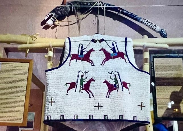 Following the death of Sitting Bull according to Ron His Horse is Thunder, it is believed many of his possessions were taken by the Indian police. There have been a few artifacts from Sitting Bull over the years that have been found and authenticated. One of these was a pipe and tobacco pouch, and a headdress that for a time was loaned and displayed at the North Dakota Cowboy Hall of Fame (NDCHF). While the headdress is back at its home at Sitting Bull College in Fort Yates, the NDCHF is proud to be able to display a beautiful and intricate pictograph vest that is believed to be one made for Sitting Bull during his time in Canada. It is on loan from Ross Rolshoven, a NDCHF Board member and collector of western and Native American artifacts.