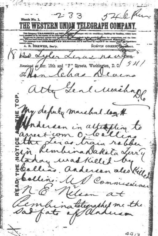 U.S. Deputy Marshal William Anderson was born in Kentucky in 1840, spent part of his early life in Illinois, and ultimately his family settled in Texas. Anderson first served in the Confederacy during the Civil War, and then switched sides and joined an Illinois regiment. After the war he returned to Texas. Prior to being appointed a U.S. Deputy Marshall in 1872, Anderson raised cattle. Anderson had the reputation as an expert marksman and was relentless in his pursuit of dangerous outlaws. He was determined to end the saga of the Sam Bass gang and their criminal exploits. The one who still had eluded the law was his old friend William Collins. Knowing Collins the way he did, he monitored his wife’s mail and intercepted a letter from Collins in Pembina. Anderson left Texas for Pembina on October 29th to get his man.