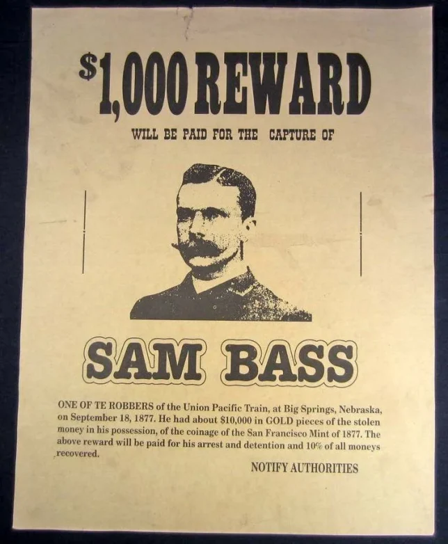 The Sam Bass Gang was a notorious band of outlaws known for robbing stagecoaches and trains. One of the gang’s most infamous robberies was the Union Pacific train robbery in Nebraska at Big Springs, a remote watering station. On September 18, 1877, the band captured the station master, destroyed the telegraph and forced him to signal the train to stop. Their take was disappointing at first, but then they found six hidden wooden boxes with $60,000 of newly minted gold pieces. This haul was unprecedented at the time. After the robbery, the group split up hoping to make evading the law easier. Joel Collins was killed in a shootout in Kansas three days later.