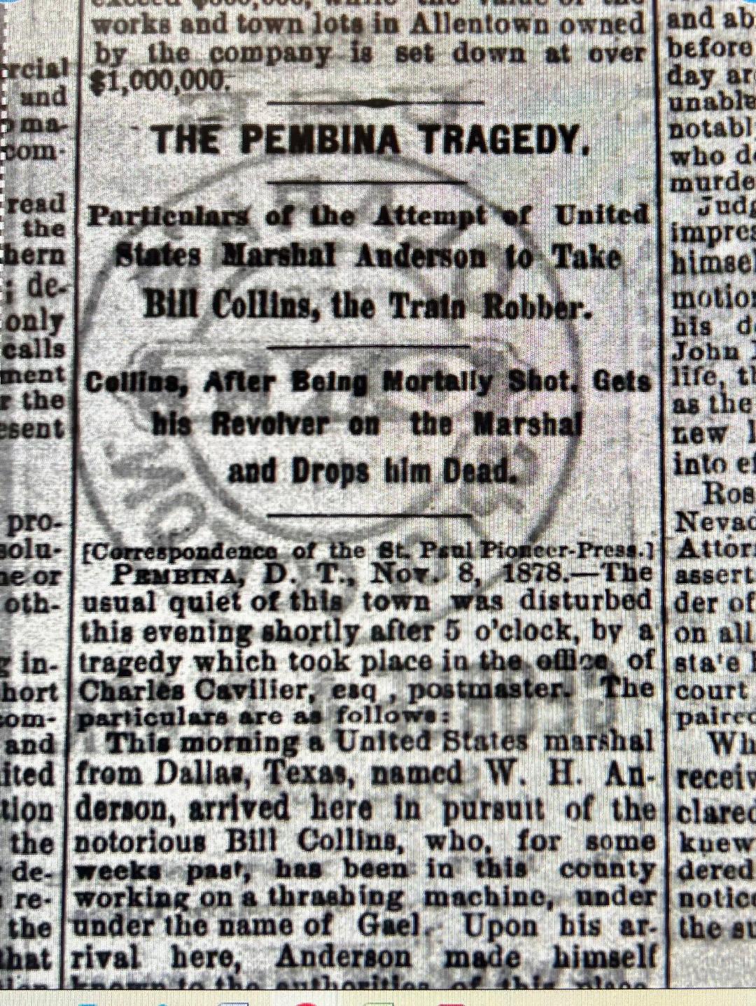 Late afternoon on November 8, 1878, with the sun’s warmth still lingering, two men lay dead in the Pembina, North Dakota post office. This was the tragic end to a once close friendship. William Collins and William Anderson had gone to school together in Texas. They became the kind of good friends that had stood as best men at each other’s weddings a decade before. In the time since, their lives diverged in directions that could not be reconciled.